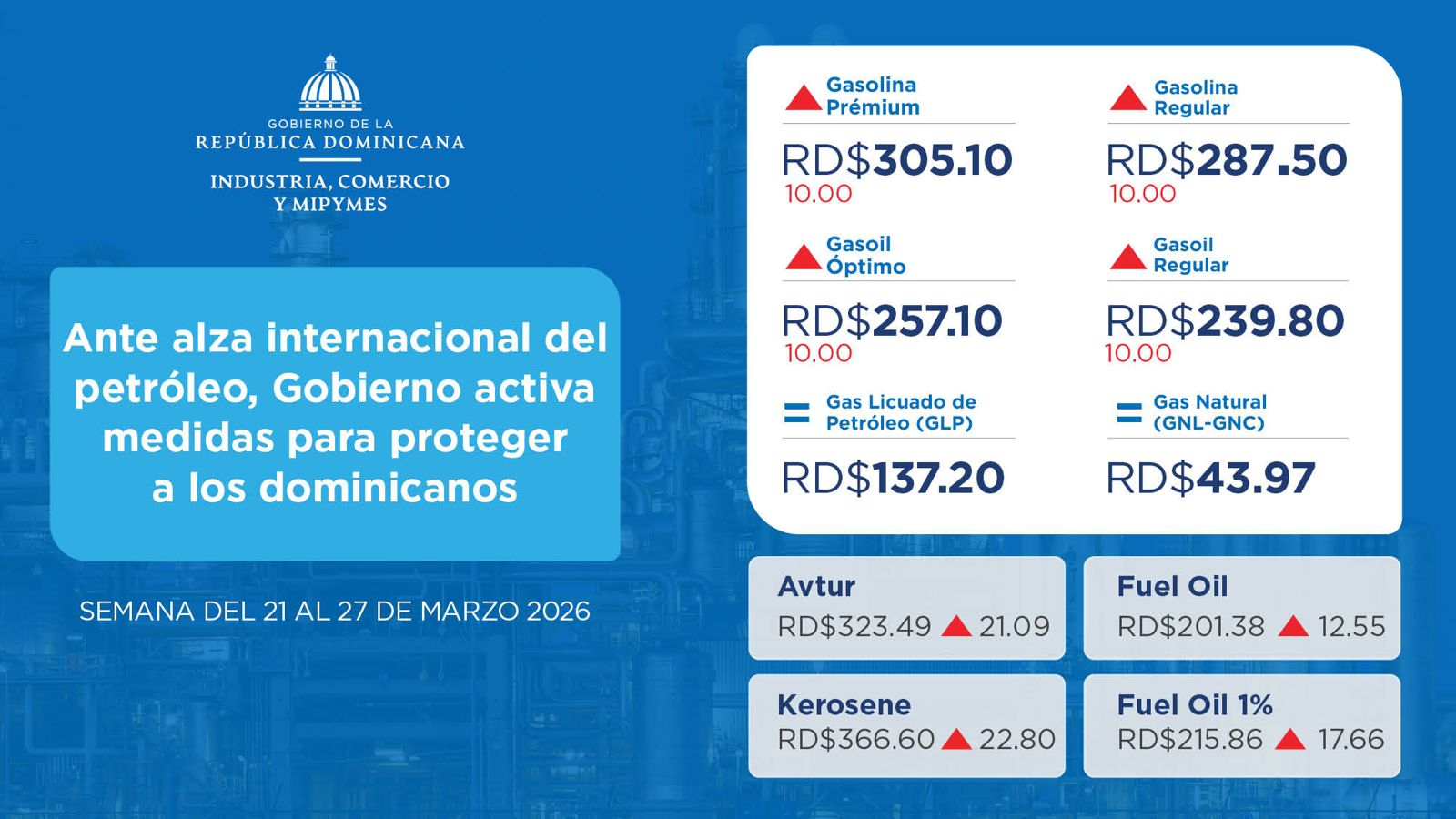 - Kerosene: RD$366.60 por galón (sube)